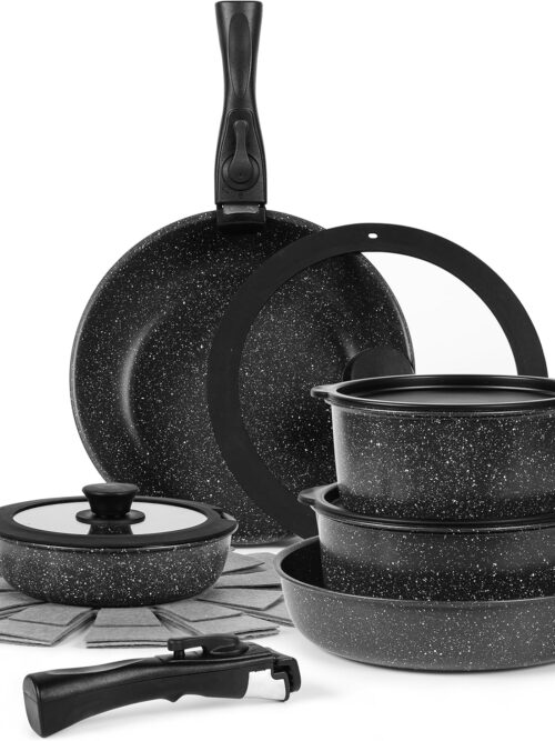 - Stay Cool Handle & Glass Lid: The bakelite handle of this kitchen pots and pans set provides a stable and comfortable grip, with heat-resistant properties to ensure you don’t have to worry about burning your fingers when handling the nonstick cookware set. The ergonomic design of the tempered glass lid allows you to monitor the cooking process easily and prevents splashes on your stove.