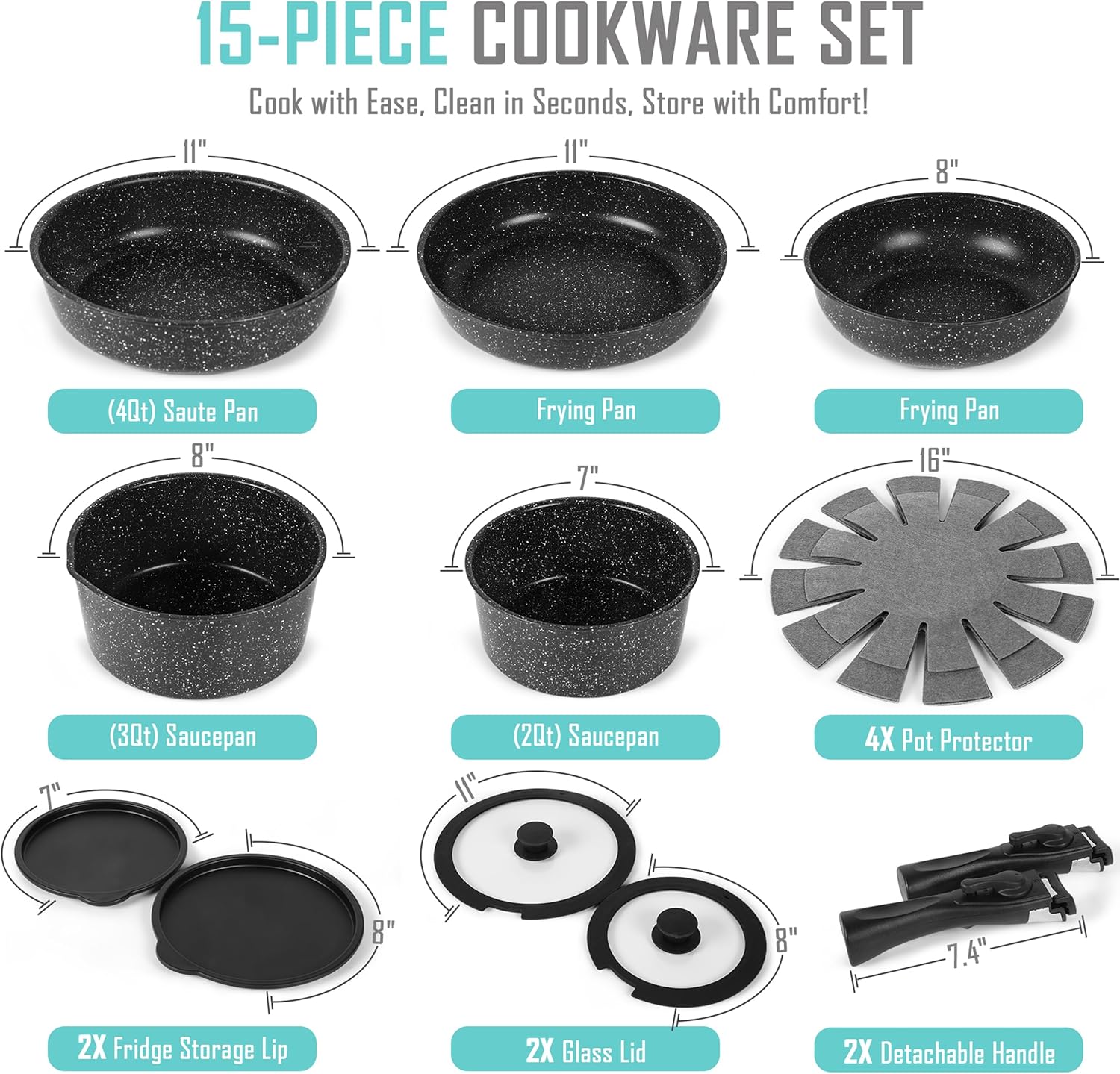 - 8-Piece Induction Cookware: Our non-stick pots and pans set includes a 13.2” frying pan with a tempered glass lid, an 11.82” frying pan set with a tempered glass lid, a 5.4-quart casserole pot with a tempered glass lid, and a 2.9-quart saucepan pot set with a tempered glass lid. Suitable for electric stovetops, gas, induction, halogen, furnaces, and almost all types of stovetops.