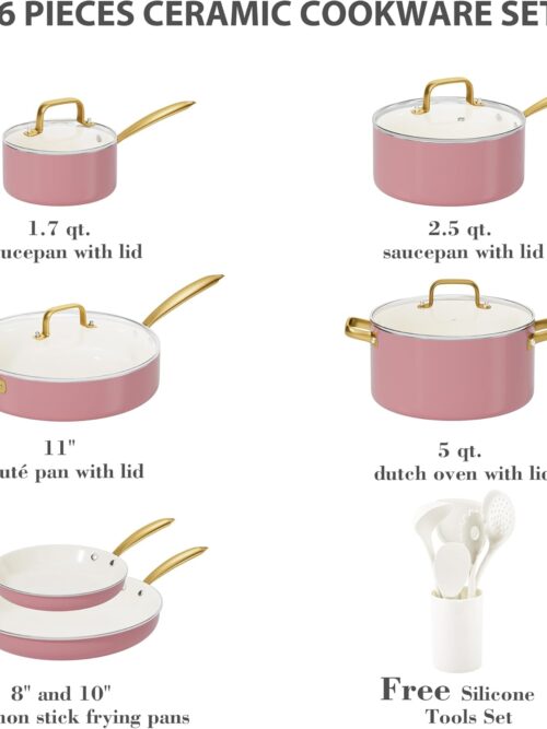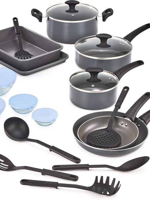 - Kitchen Cookware & Bakeware Set 30 Piece – Include 5.5-inch fry pan / 8-inch fry pan / 11-inch fry pan / 9.5-inch deep fry pan with lid / 9.5-inch square steak fry pan / 1.5qt saucepan with lid / 3qt casserole with lid / 5qt casserole with lid / 5qt steamer / Baking form:14″x9.2″x2.2″ / Baking form:11.6″x6″x2.5″ / Rect baking tray 14.6″x9.8″x2.2″ / Round spring form 10″x2.5″ / 12 cup muffin pan:16″x10″x1.3″ / 3 pcs silicone utensils / 3pcs ceramic knives / 6 pcs dining placemat
